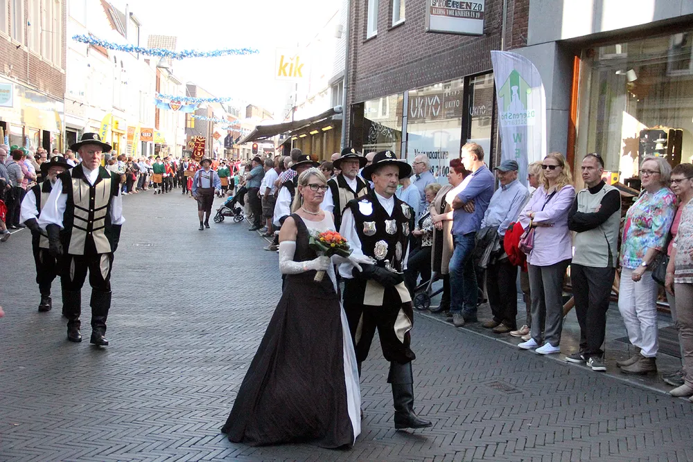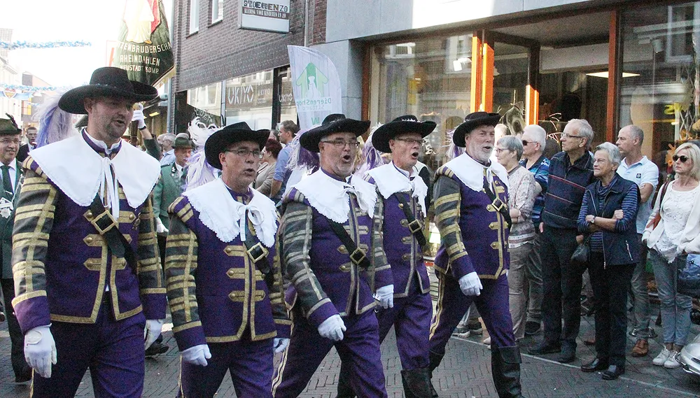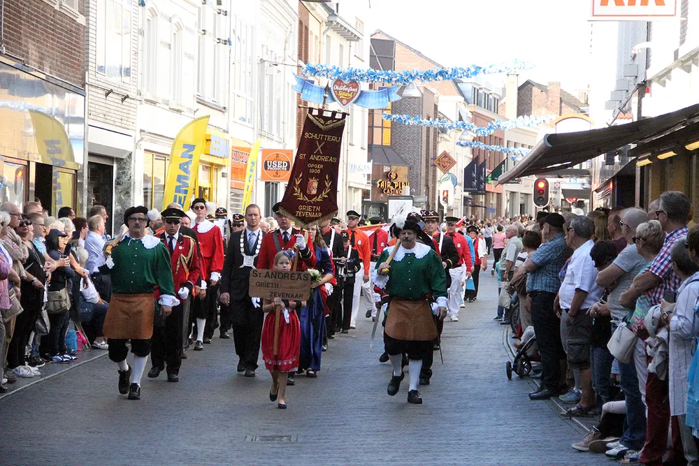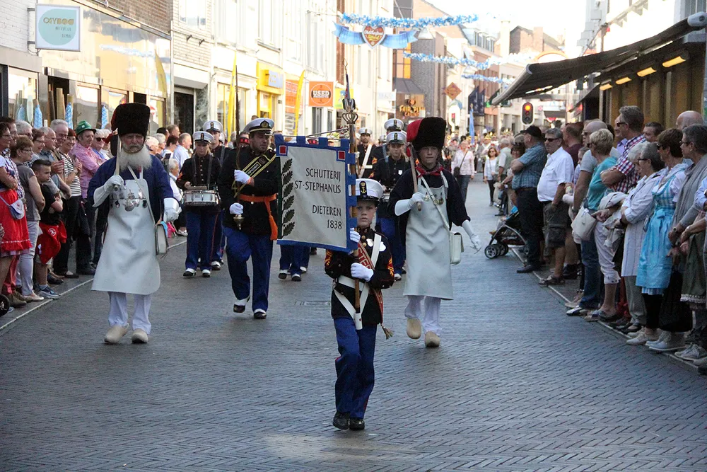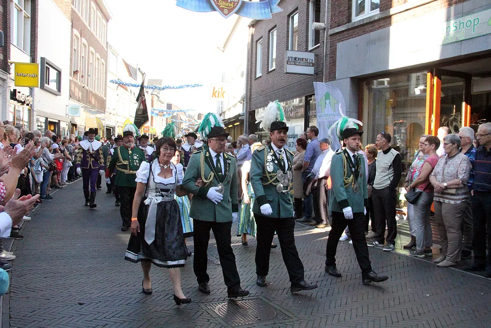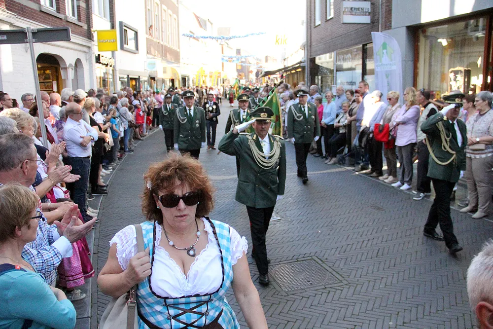 Vanwege het prachtige zomerse weer stroomden de straten van het centrum, het Oktoberfeestterrein, de feestpaviljoens en de terrassen op de Markt al vroeg vol met publiek. Het STIHL Timbersports® European Champions Trophy Qualifier, een kwalificatiewedstrijd voor het Europees Kampioenschap, had over belangstelling evenmin te klagen. Maar in eerste instantie ging de aandacht uit naar de fraaie stoet met 35 deelnemende schutterijen en gilden uit Nederland, België en Duitsland, die ruim een uur lang door de straten van het centrum trok.