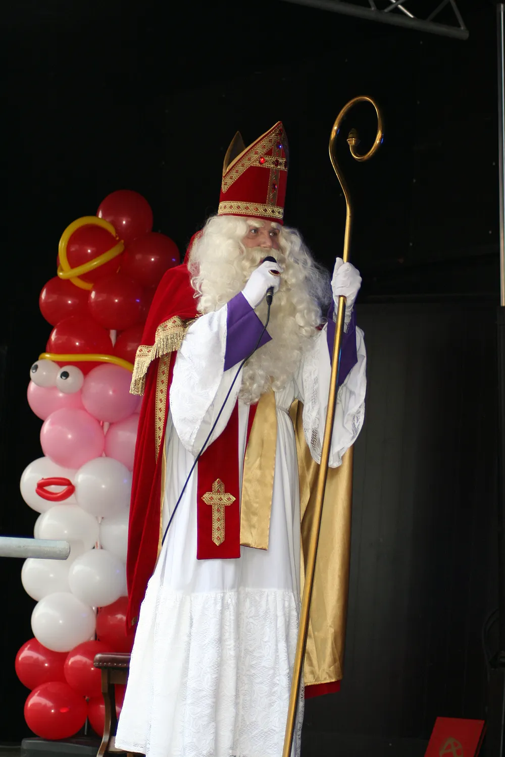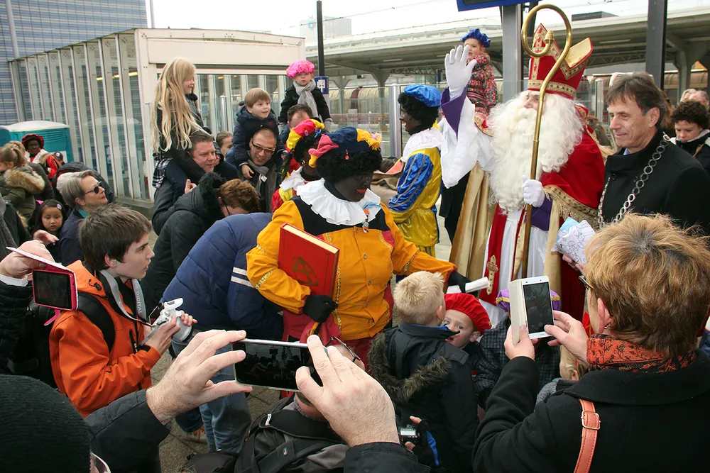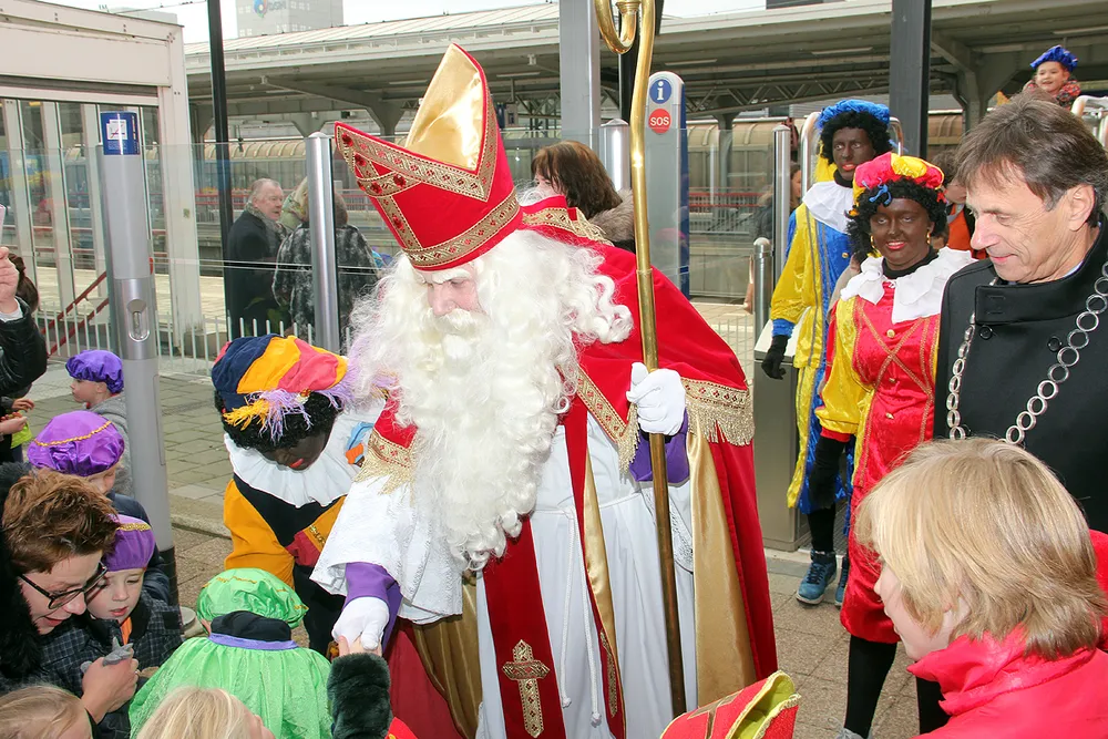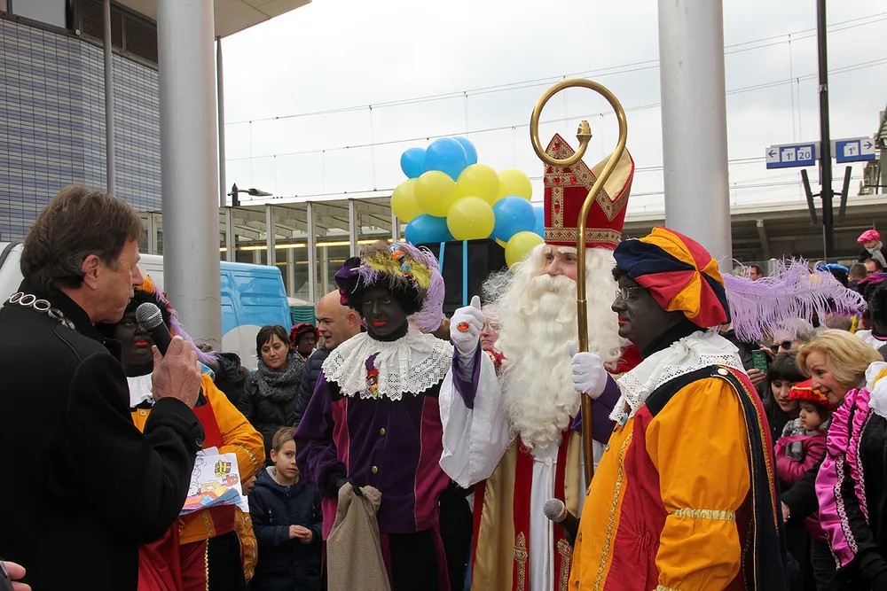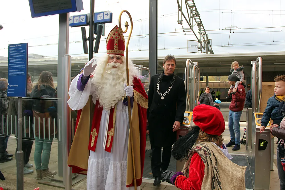 Zoals gewoonlijk arriveerde de Sint per trein, die luid claxonnerend op het station arriveerde. Op het Stationsplein werd hij hartelijk welkom geheten door talloze kinderen, al dan niet zelf verkleed als Sint of Piet, en kreeg hij tekeningen cadeau. Dit jaar trakteerden vier fietspieten publiek en Sint daar bovendien op een korte show op hun eenwielers.