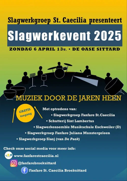 Op zondag 6 april organiseert de slagwerkgroep van Fanfare St. Caecilia Broeksittard een slagwerkevent met het thema Muziek door de jaren heen.
