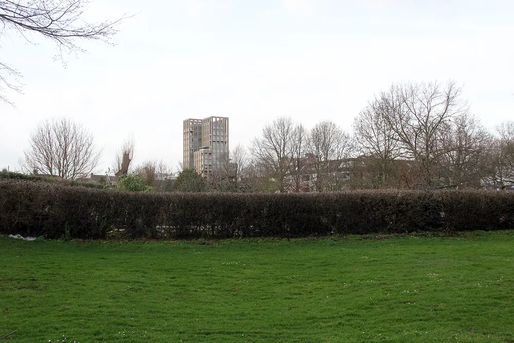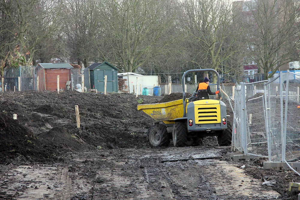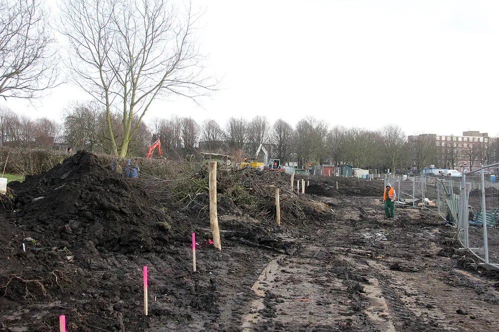 De werkzaamheden op de oostelijke schootsvelden zijn in volle gang. Er wordt hard gewerkt in het gebied, dat er nu nog kaal en modderig uitziet.