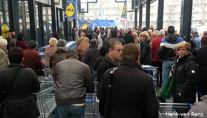 De passage tussen Annastraat en Koningsplein in Geleen stond woensdagochtend kort voor winkelopeningstijd stampvol mensen die wachtten op de opening van de nieuwe Lidl.
