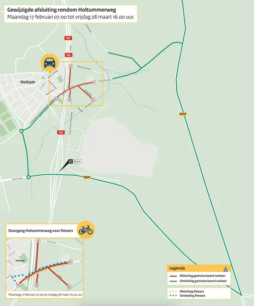 Vanaf 28 maart is de Holtummerweg afgesloten waarbij de Grote Allee en de Kleine Dries weer open zijn. Maar Pasveld aan de Dr. Hub van Doorneweg is afgesloten. De omleidingen blijven in tact. De afsluiting duurt tot vrijdag 9 mei. Deze afsluitingen zijn noodzakelijk voor de voortgang van de verleggingen van kabels en leidingen in het kader van de wegverbreding van de A2.