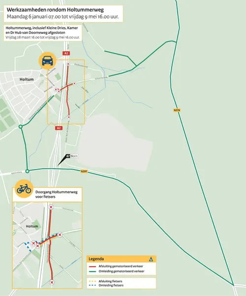 De eerder aangekondigde afsluiting van de Holtummerweg wordt aangepast. Van maandag 17 februari 07:00 uur tot vrijdag 28 maart 16:00 uur zullen de werkzaamheden doorgaan met een gewijzigde verkeerssituatie.