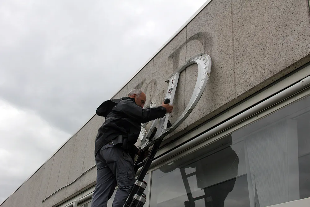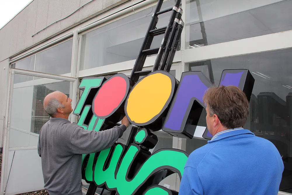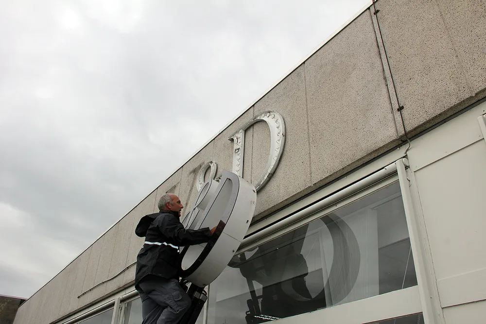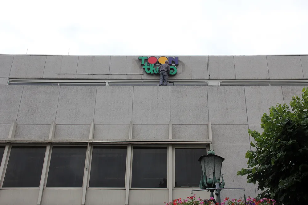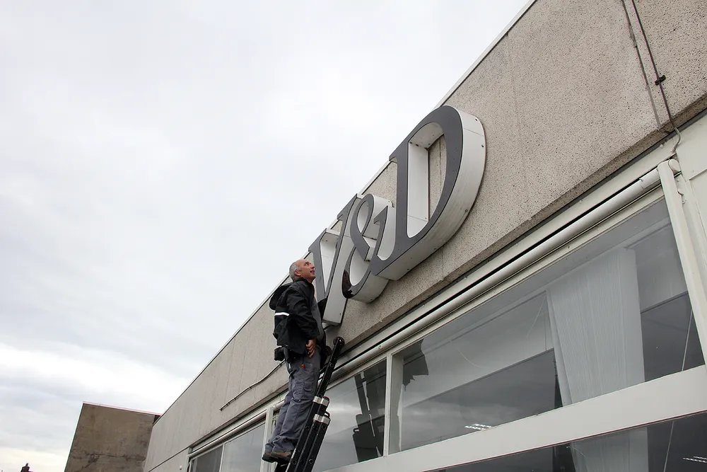 Woensdagochtend werd het logo van V&D van de gevel van het voormalige warenhuis aan de Markt in Sittard verwijderd om plaats te maken voor dat van de belevingsexpositie Toon Thuis.
