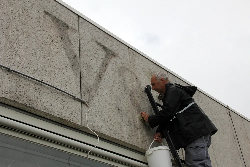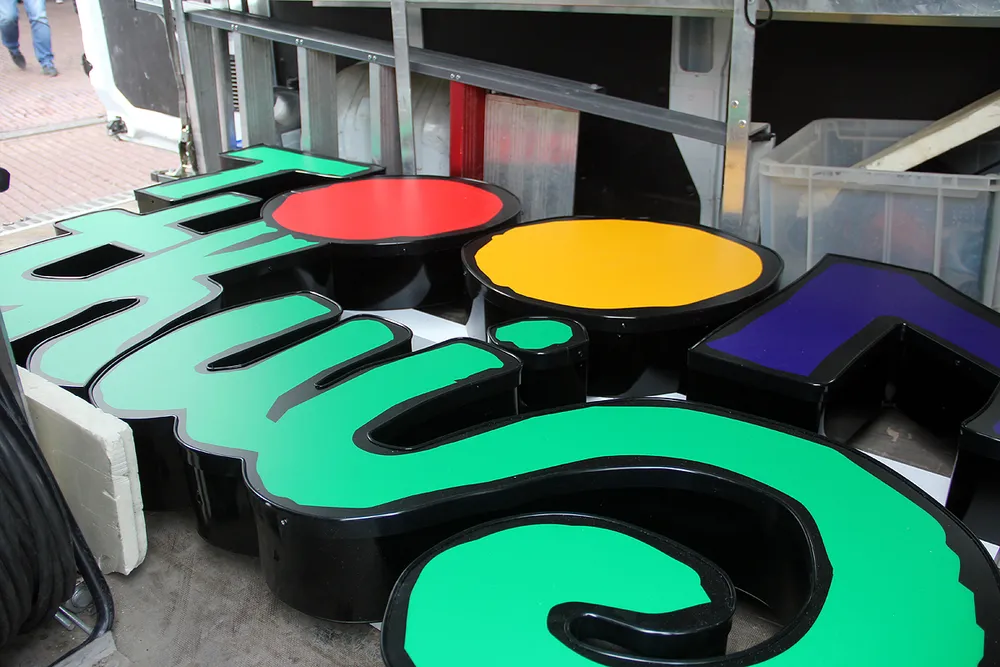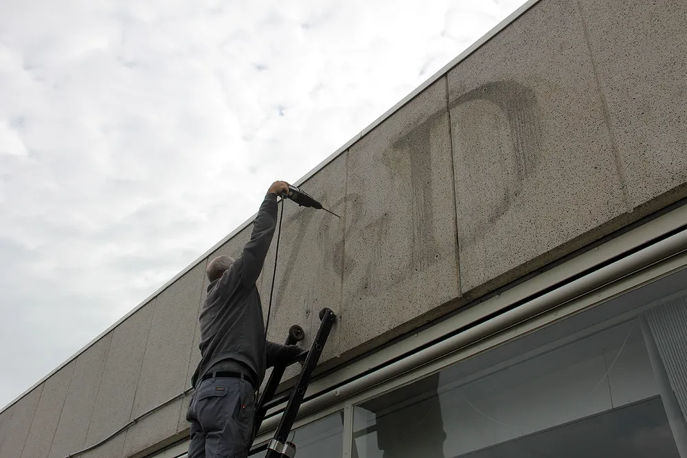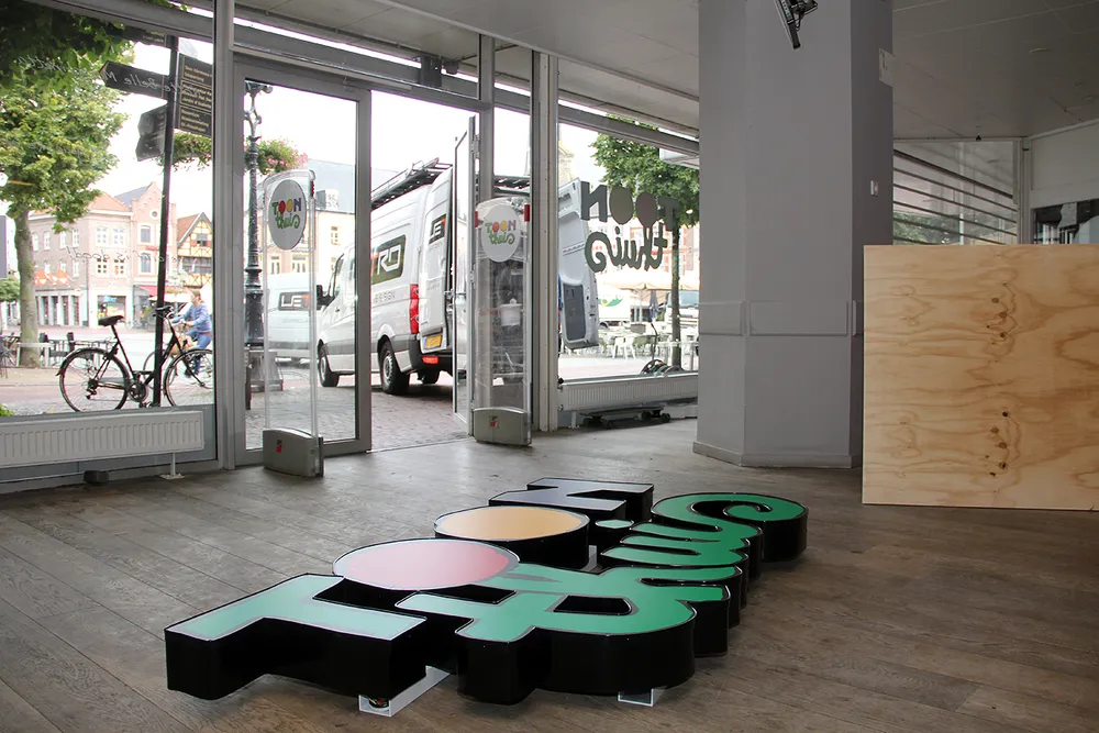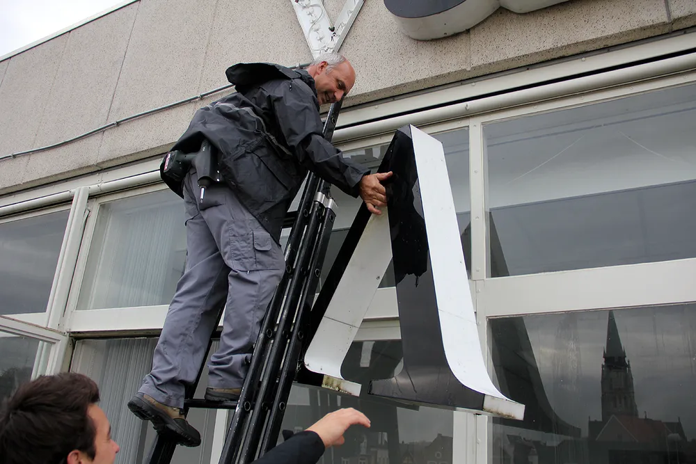 De klus was in een paar uurtjes geklaard. Ook het V&D logo elders op de gevel werd vervangen door dat van de expositie. De komende weken wordt er nog hard gewerkt om de expositieruimte op de begane grond van het voormalige warenhuis in te richten.
