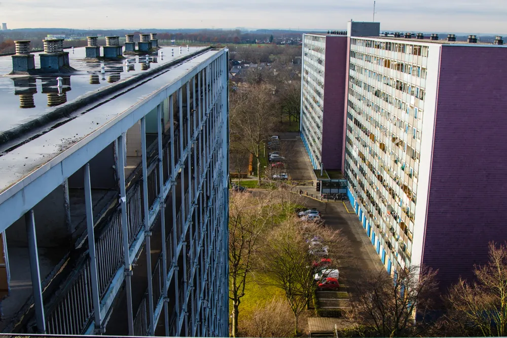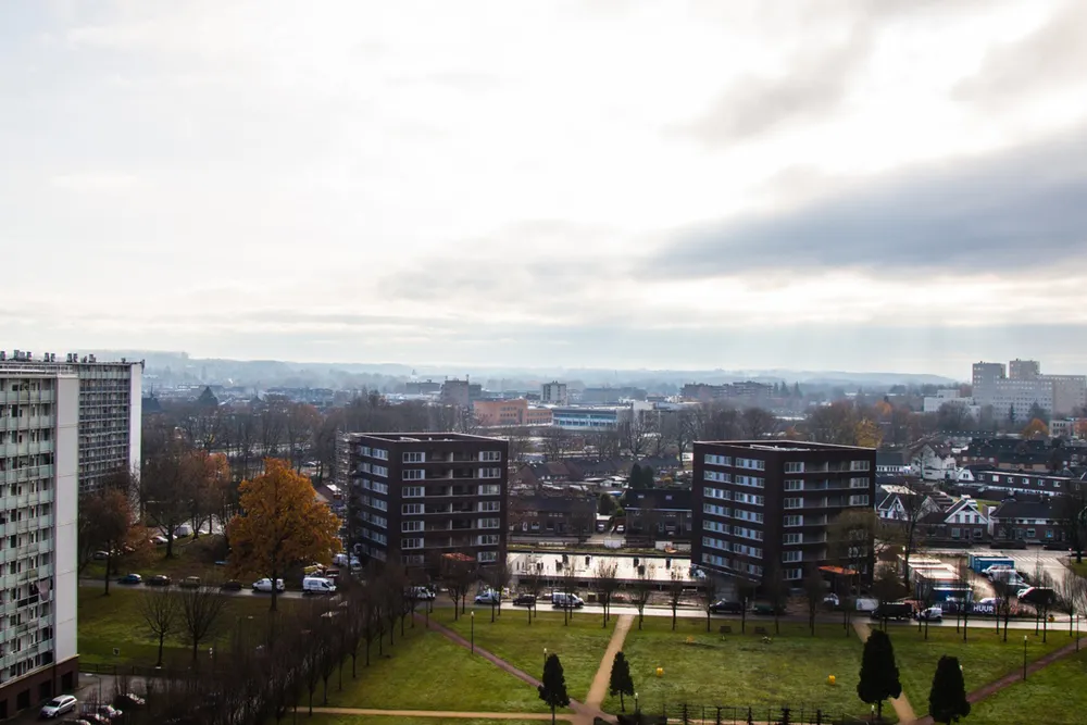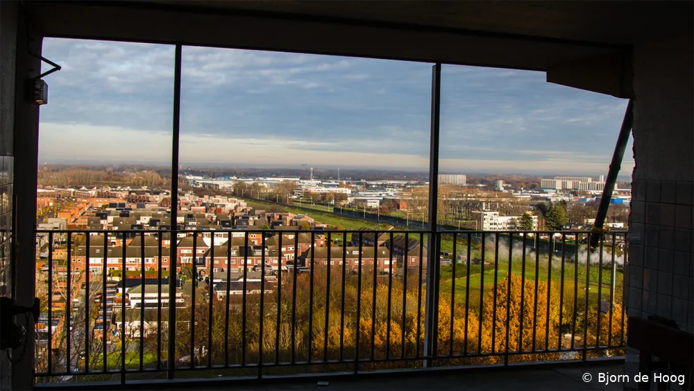 Het uitzicht toont de wijk Hoogveld en Industriepark-Noord in Sittard, gescheiden door de spoorlijn naar Roermond.