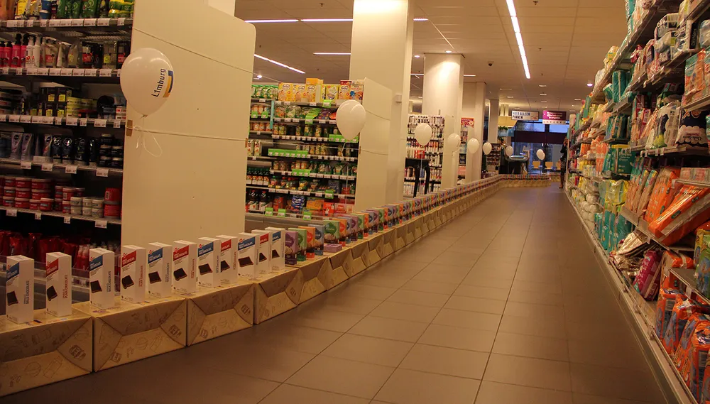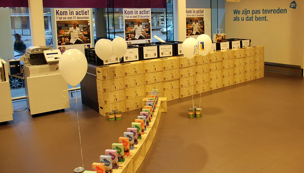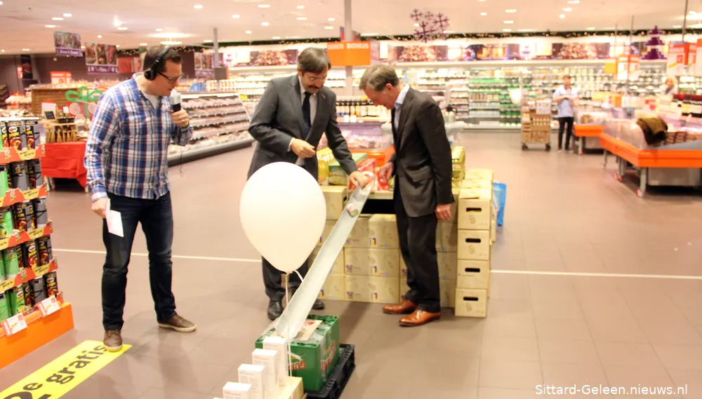 Beide heren activeerden door middel van een blikje tomatenpuree een dominoslang van pakken hagelslag die dwars door de supermarkt langs de kassa's naar een inleverpunt liep waar mensen ten bate van de voedselbank houdbare levensmiddelen kunnen doneren.