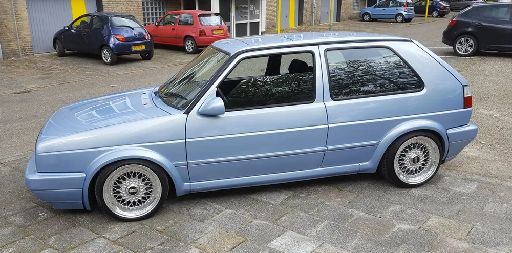 De metallic grijsblauwe driedeurs GOLF GTI G60 118KW U9 uit 1990 is door de eigenaar onder meer voorzien van opvallende velgen.
