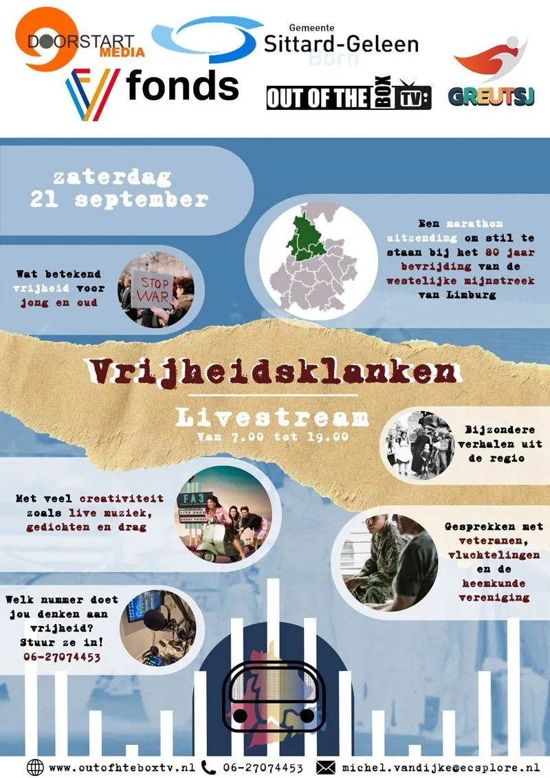 In de dagen tussen 15 en 19 september 1944 werd deze regio bevrijd door onder andere de Amerikaanse Tweede Pantserdivisie. Ter ere van deze historische gebeurtenis en om het belang van onze huidige vrijheid te onderstrepen, presenteren Out of The Box TV, Doorstart Media en Greutsj een uniek evenement: Vrijheidsklanken: Een Ode aan 80 Jaar Vrijheid. Dit evenement wordt op zaterdag 21 september live uitgezonden vanuit de Out of the Box TV-studio in Born via online-radio en livestream.