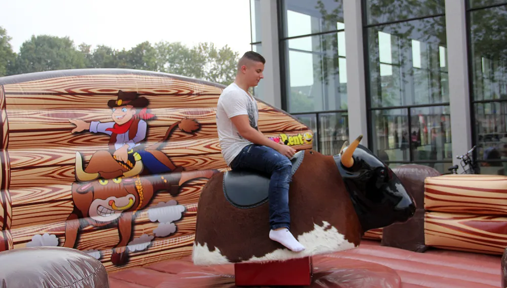 Het was gezellig druk op het plein. Er waren diverse Dj’s, foodtrucks, loungeplekken om lekker te hangen en er was voor wat randvermaak gezorgd, zoals een mechanische stier, een klittenbandwand waar je jezelf, gehuld in een klittenbandpak, tegenaan kon werpen, een rad van fortuin, een photo booth en een mini bioscoop van Foroxity.