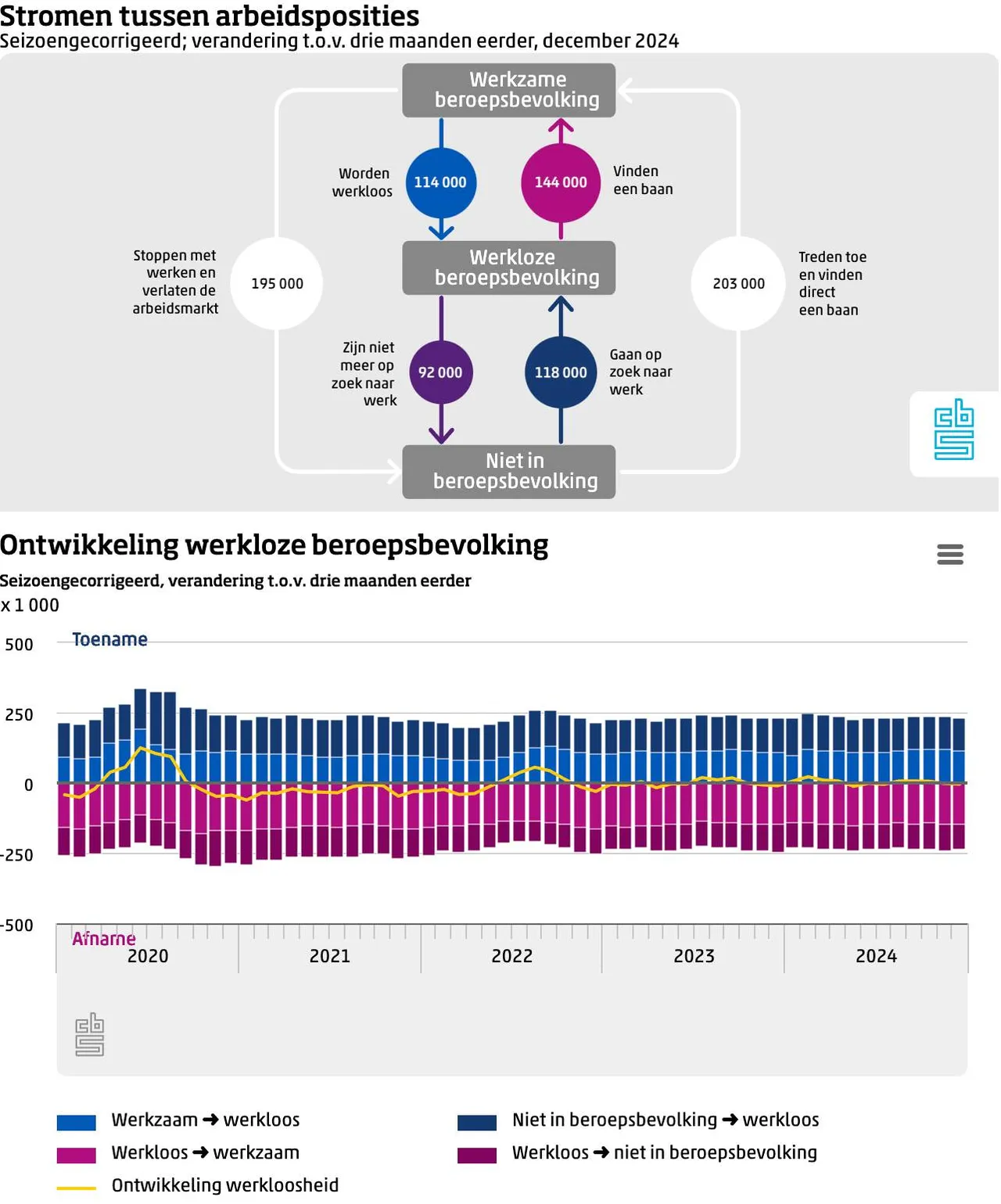 De werkloosheid kan toe- of afnemen door vier verschillende stromen. Twee van die stromen kunnen de werkloosheid laten dalen. De eerste is de stroom van werklozen die een baan vinden. De tweede is de stroom van werklozen die stoppen met zoeken, en de arbeidsmarkt en dus de beroepsbevolking verlaten. In totaal waren er in december 236 duizend mensen die drie maanden eerder nog werkloos waren.Er zijn ook twee stromen die de werkloosheid kunnen laten stijgen. Het gaat om werkenden die hun baan verliezen en om mensen die zich eerder niet aanboden op de arbeidsmarkt, maar op zoek zijn gegaan naar werk. Als ze niet meteen werk vinden, worden ze deel van de werkloze beroepsbevolking. Het totale aantal mensen dat werkloos werd, was met 232 duizend mensen lager dan de uitstroom van 236 duizend. Daardoor nam het aantal werklozen in de afgelopen drie maanden licht af met gemiddeld 1 duizend per maand.