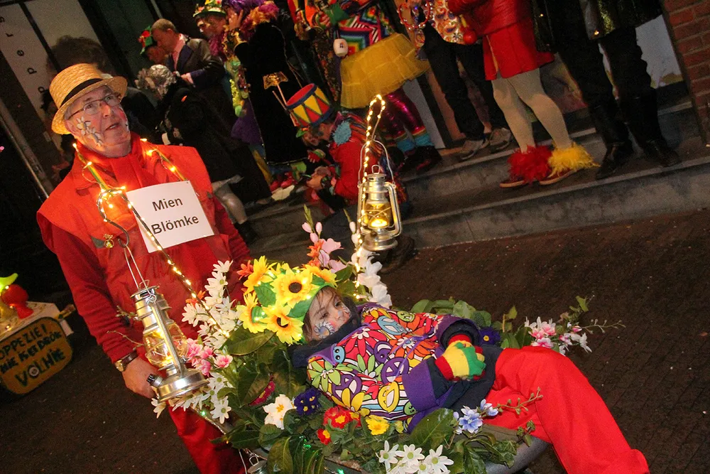 De deelnemers duwden elk een opgetuigde en van verlichting voorziene kruiwagen (sjörskar) voor zich uit. Wonderbaarlijk wat creatieve carnavalistische geesten daarmee kunnen. En net als in de grote optocht ook hier weer de nodige kolder, soms ook met een actuele lading.