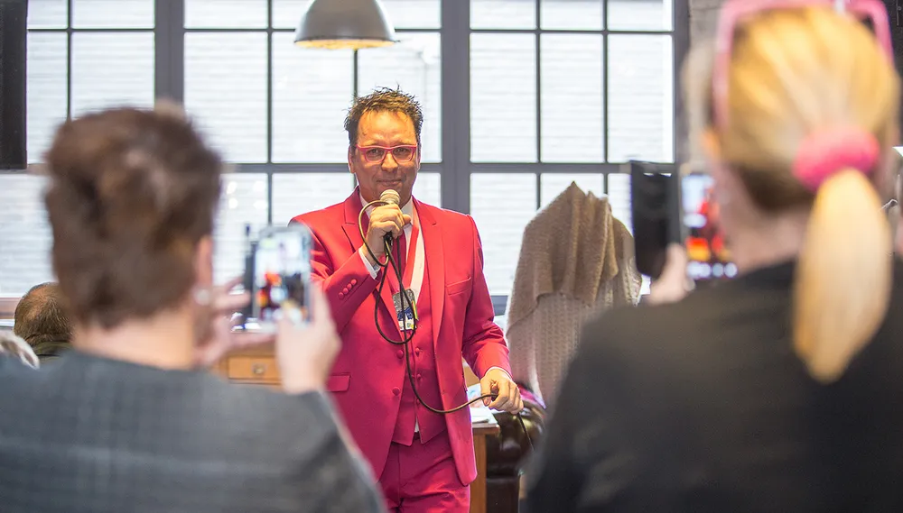 Paul Jean Jessen, de zanger van de Sittardse carnavalsschlager Raoze, heeft Wollstreet een muzikaal bezoek gebracht als dank voor het breien van een 11-tal Raoze-kols.